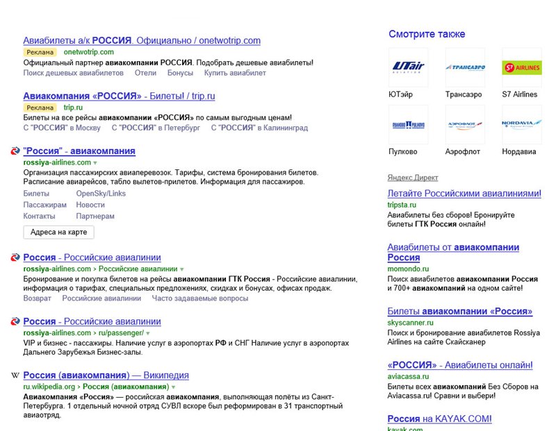 Москва, запрос "авиакомпания россия" - ситуация аналогичная, правый блок присутствует, объявлений в подвале нет.