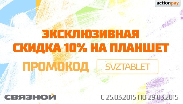 Партнерская программа "Связной - Интернет-магазин электроники" предоставляет промо-код на 10%-ю скидку на планшеты (все, кроме планшетов Samsung) - SVZTABLET.
