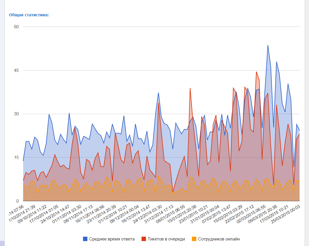 El Marshal Che, нет, отнюдь, вот, пожалуйста, статистика с сентября 2014. Действительно, в 2015 стало медленней, но и количество тикетов увеличилось, а обучить полноценно новых сотрудников еще не успели, к сожалению.