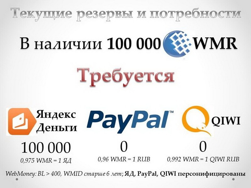 Приветствую Вас уважаемые форумчане! Я готов обменять Ваши PayPal/ЯД/QIWI на мои WMR. Интересуют любые предложения от 1 000 рублей.