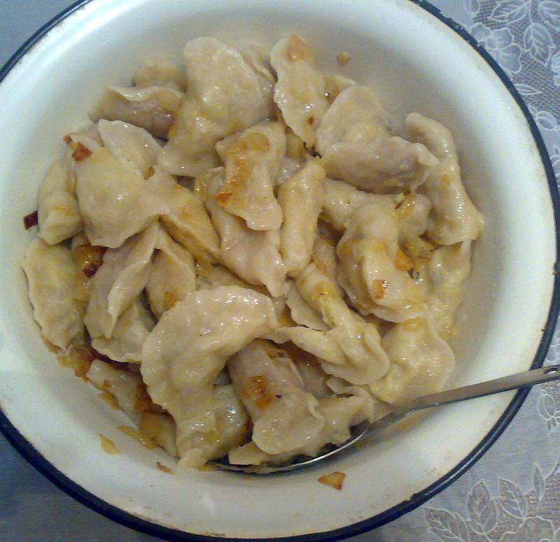 Меня сегодня вареничками на обед накормили. Одни с капусткой, другие - картха+печёнка.