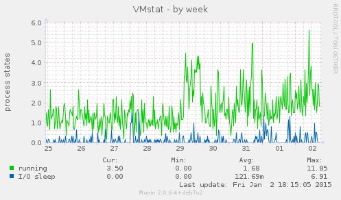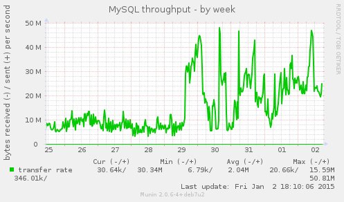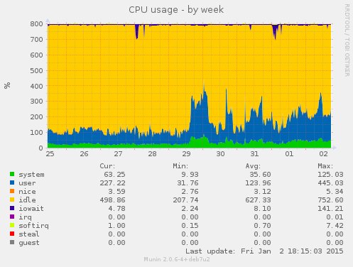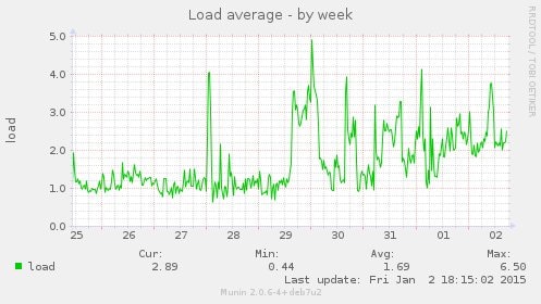 К новому году почти у всех падения трафика (у меня тоже падение трафика в 3-4 раза) и только поэтому я заметил эту странность. Зайдя сегодня в мунин и ожидая увидеть на всех графиках синусоиды вниз я заметил повышение нагрузки с 29, которая держится по сей день.
