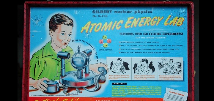 Набор для юных физиков Gilbert Atomic Energy Lab. Игрушка, появившаяся в продаже в 1951 году на волне интереса к расщеплению атома, содержала образцы изотопов урана-238, электроскоп, спинтарископ, камеру Вильсона, счётчик Гейгера и учебник по физике. Тогда удовольствие почувствовать себя юным учёным стоило недёшево — $50, что примерно соответствует сегодняшним $400.