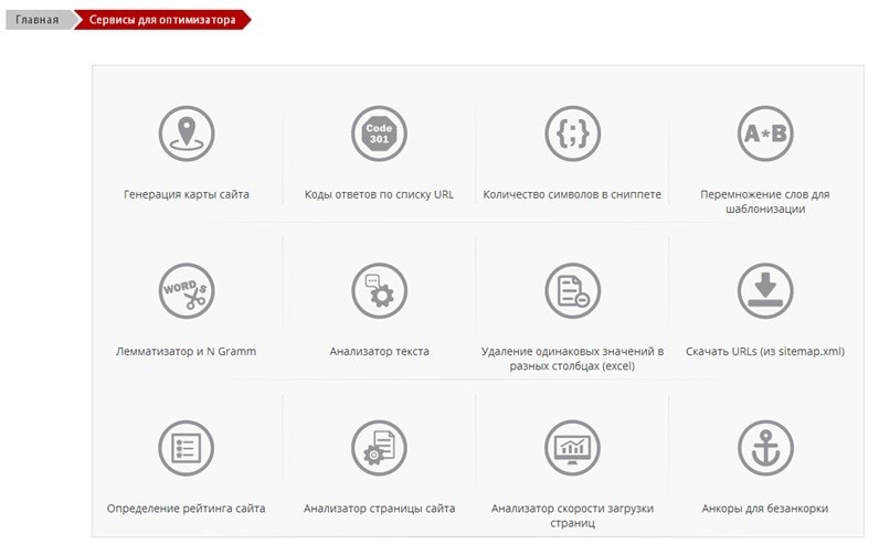 Более 16 сервисов для оптимизаторов. Анализатор текста и страницы, лемматизатор и создание N-Грамм, подсчет количества слов в сниппетах, формирование карты сайта, перемножение слов для шаблонизации текстов, анализатор скорости загрузки страниц, построение анкор-листа и многое другое.