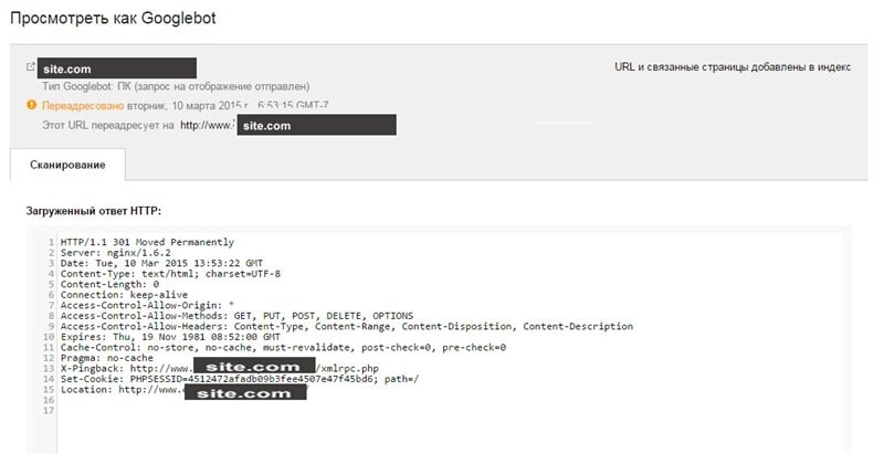 Сайт глазами гугл бота Дает такой серверный ответ т.е. 301 редирект