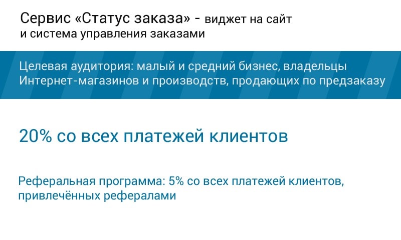 Партнёрская программа сервиса для малого и среднего бизнеса. Сервис - виджет "Статус заказа", позволяющий быстро установить на коммерческий сайт или в Интернет-магазин средство отслеживания клиентами своих заказов. Заказы добавляются через удобную панель управления с возможностью максимально автоматизировать процесс смены статусов.
