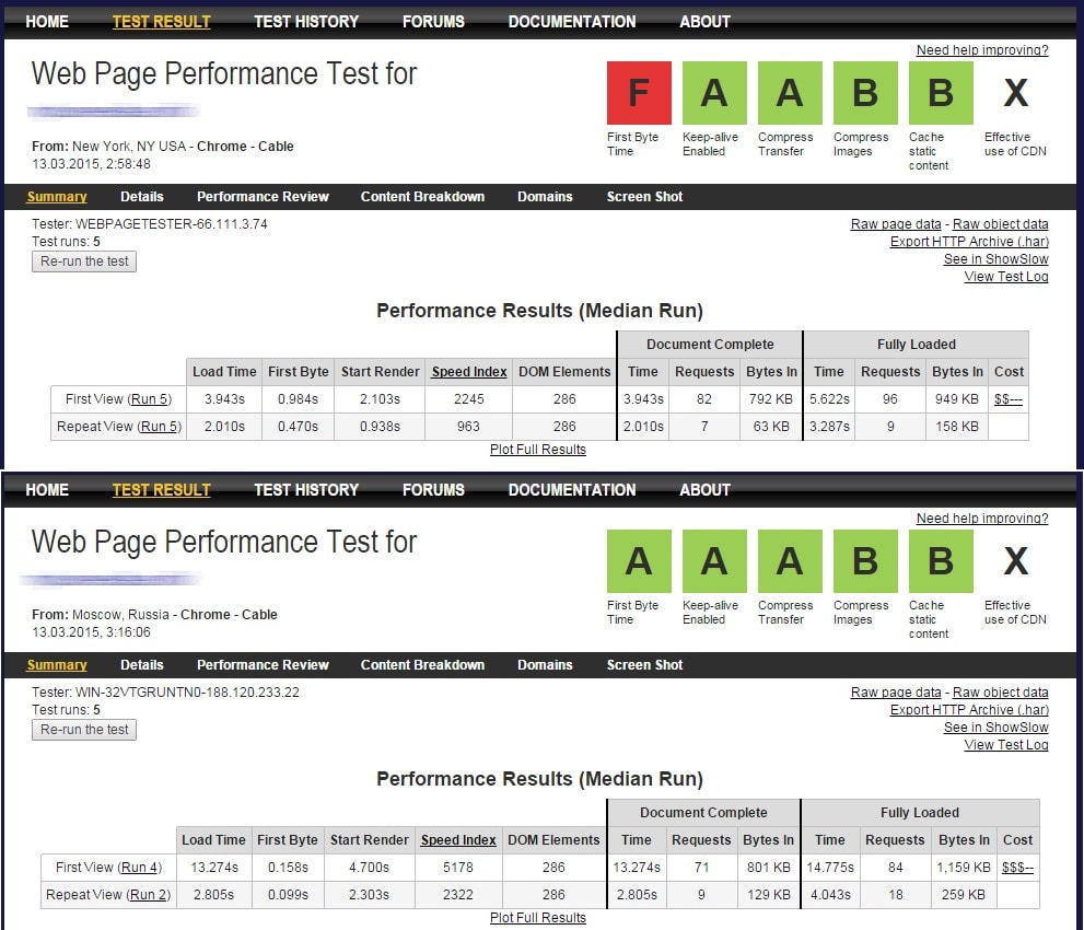 Провел для интереса тесты на webpagetest.org выполняя запросы из Нью-Йорка в Москву и из Москвы в Москву.