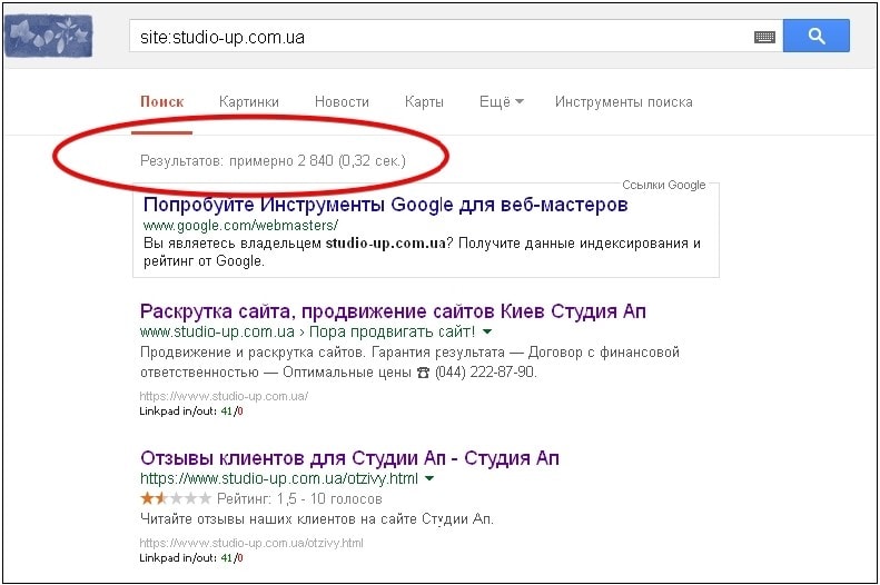 При проверке количества проиндексированных страниц в Google (site:url сайта) в самом верху выводит такую надпись: "Результатов: примерно 2 840 (0,24 сек.)"
