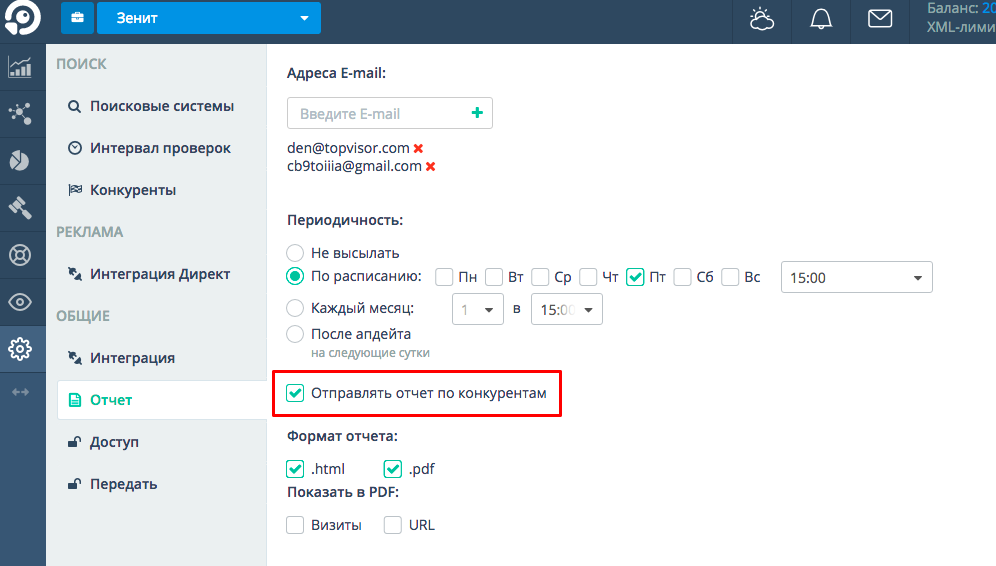 Это, конечно, не полноценный отчет. Т.е. не отчет в режиме сравнения по конкурентам. Но, в одном письме будут все pdf-ки c позициями конкурентов. Количество pdf-ок будет равно количеству конкурентов в проекте.