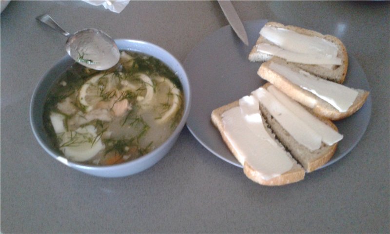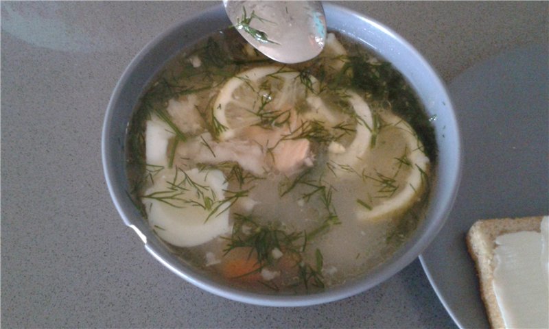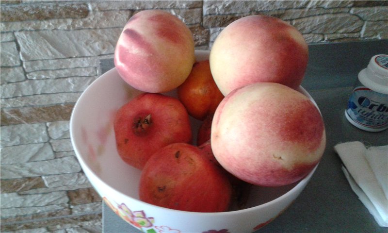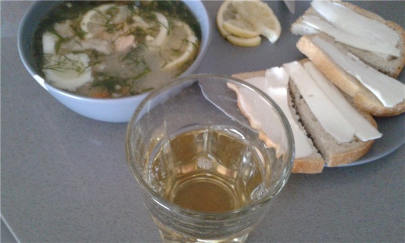 Рыбный четверг - уха из соломона и дэниса, белое вино полстаканчика, и на десерт персики и гранаты: