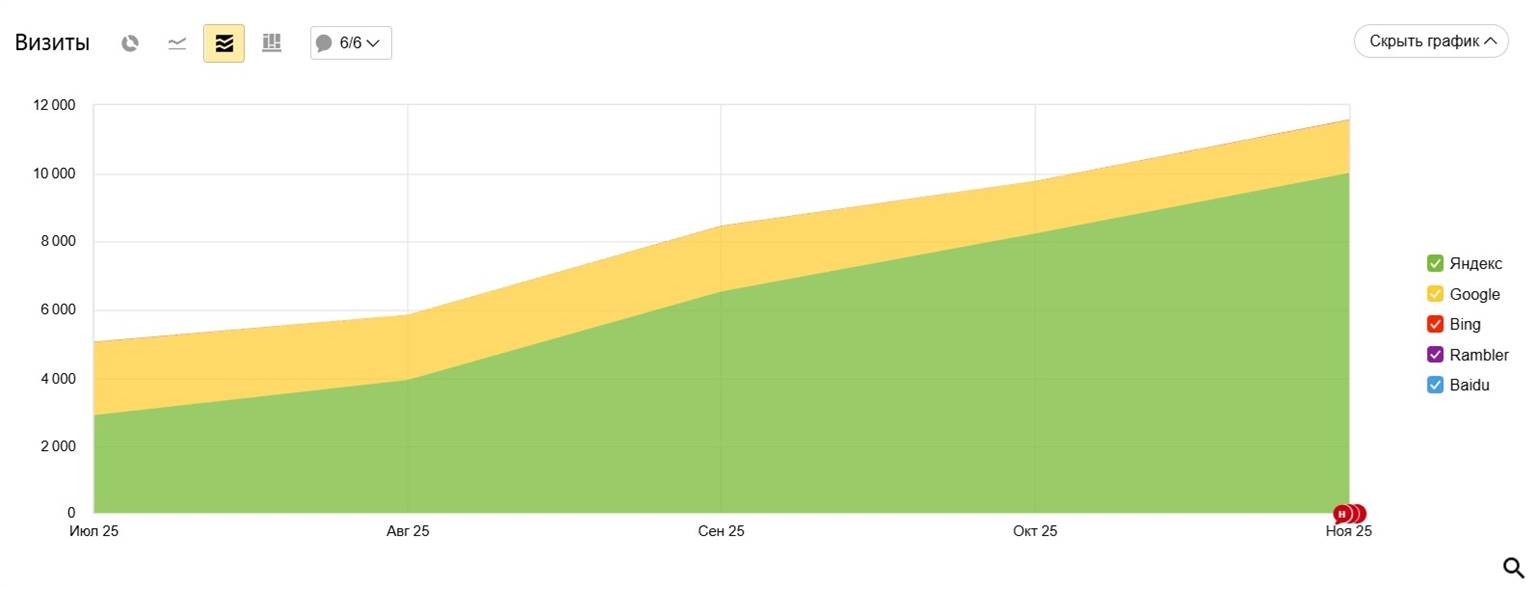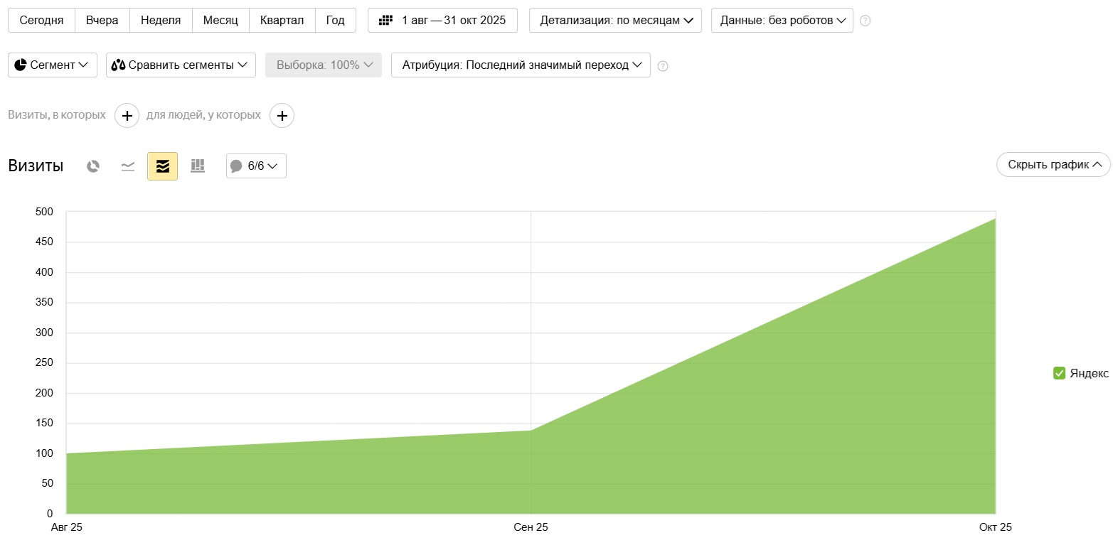 C середины августа 2025 года ведется планомерная работа над сайтом клиента. Среди проведенных работ: аудит сайта, внесение правок согласно аудиту. На графике наглядно виден результат.