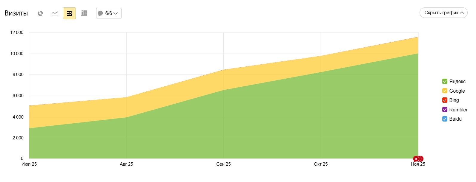 C июля 2025 года ведется планомерная работа над сайтом клиента. Среди проведенных работ: аудит сайта, внесение правок согласно аудиту. На графике наглядно виден результат.