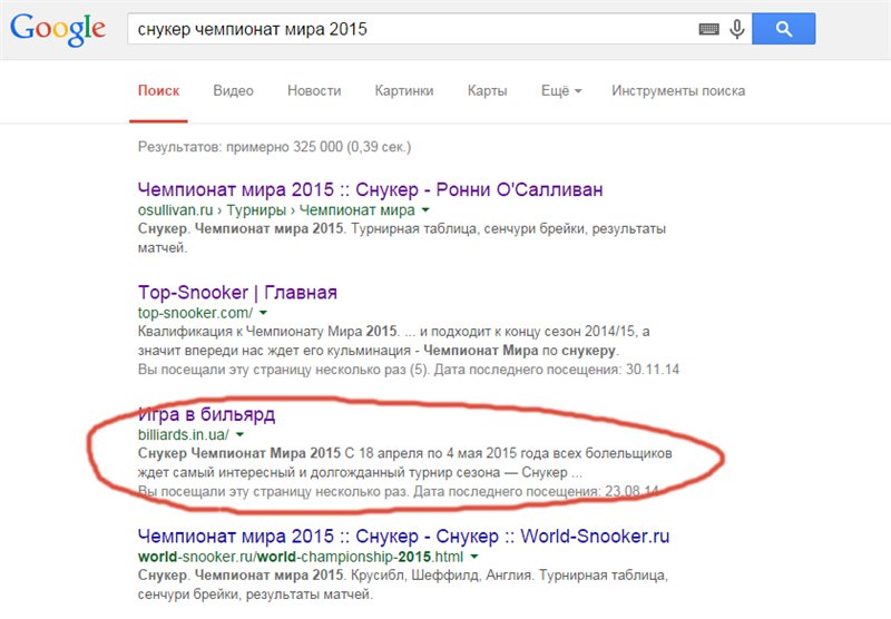 Сайт billiаrds.in.uа (набирать руками) Проблема! Google считает главную страницу сайта релевантнее страницы самой записи. К примеру, по запросу "снукер чемпионат мира 2015" вот такая картина: