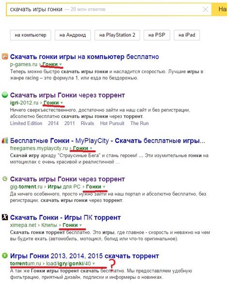 Например по запросу "скачать игры гонки" у всех конкурентов яндекс отображает www.site.com/гонки, а у меня почему-то www.site.com/104-gonki.html