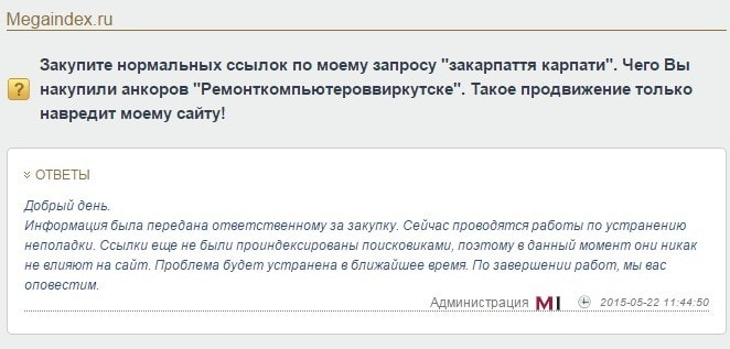 Сегодня 28 мая. Никто ничего не меняет. Закупленные ссылки с неправильным анкором висят, деньги с баланса списываются.