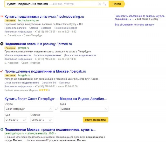 Сегодня решил посмотреть ТОП по запросу "купить подшипник москва", так мне Яндекс вывел на верх выдачи сервис по покупке авиабилетов) прямиком под Директом.