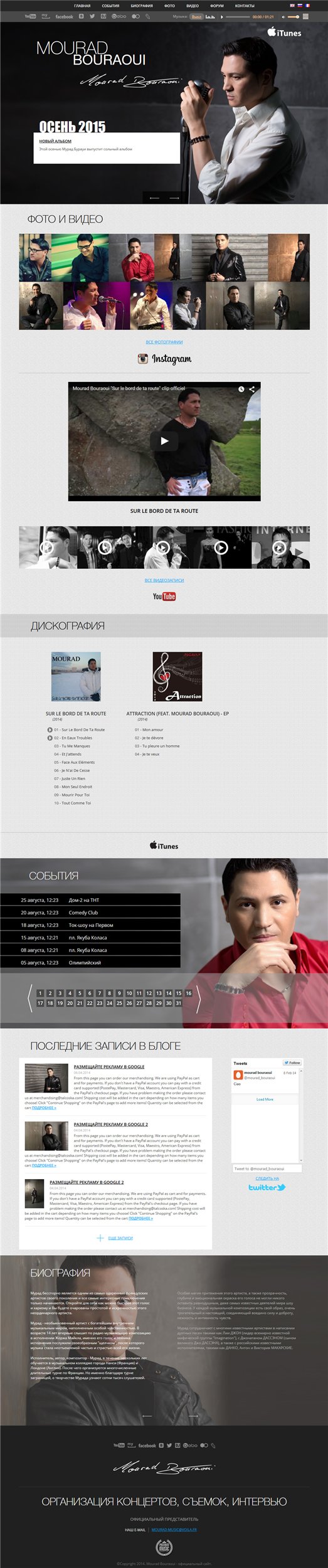 Разделы сайта - фото и видео галерея, дискография с возможностью загружать треки с дальнейшим прослушиванием в браузере, анонс ближайших событий с отметками на карте Гугл, блог исполнителя, биография, форум, контакты, проигрыватель.