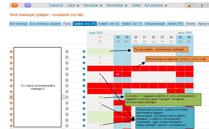 Добавлю, что график разделен на ОСНОВНОЙ состав, НОВИЧКИ и ЗАПАСНОЙ состав команды. Т.е. чтобы новички "не путались под ногами", пока тестируются, они показаны в отдельном графике. Контент-менеджер сам выставляет у исполнителя в профиле, в какой состав отнести исполнителя (т.е. когда его переводить из новичков в основной, запасной или выгнать в "архив":)))