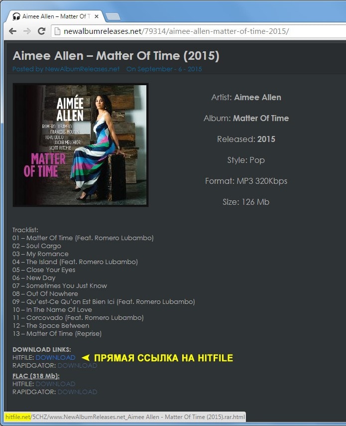 Когда я начинала работать на Хитфайле, обратила внимание, что среди ресурсов, с которых на него поступает трафик, находится некоторое количество именно музыкальных сайтов. И у этих сайтов зачастую включена RSS-трансляция обновлений с прямыми ссылками на скачивание! Приведу простую рабочую схему на примере портала NewAlbumReleases.net: