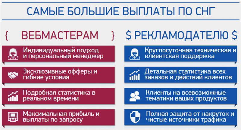 Предлагаем вебмастерам индивидуальный подход, детальную статистику и гарантированные выплаты, а рекламодателям – подбор клиентов для любой тематики товаров, круглосуточную техническую поддержку, защиту от накруток и обеспеченный результат.