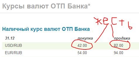 Я что-то подобное видел в ОТП-банке 12 января сего года (это не какой-то "великий" день, просто проезжал мимо этого банка в этот день и обратил внимание на совершенно дикие "ножницы" курсов). Не помню точных цифр, но продажа доллара была 80 с чем-то (допустим, 84), а покупка - 40 с чем-то (допустим, 48). Не уверен, что разница достигала 40 рублей, но подходила, и разница по разам была почти в 2 раза. По евро курс продажи был 95 (вот не помню, с копейками ли), покупки - не помню, но разница тоже соответствующая.