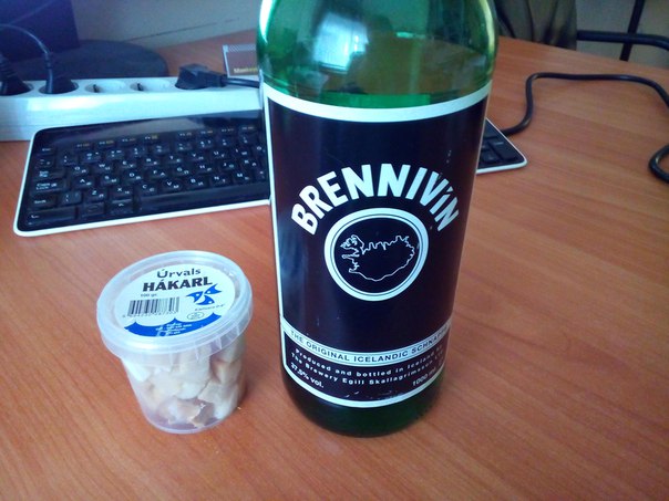 Это национальное исландское пойло Бреннивин, а также Хакарль - тухлое мясо белой акулы.