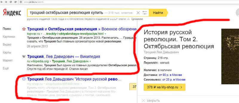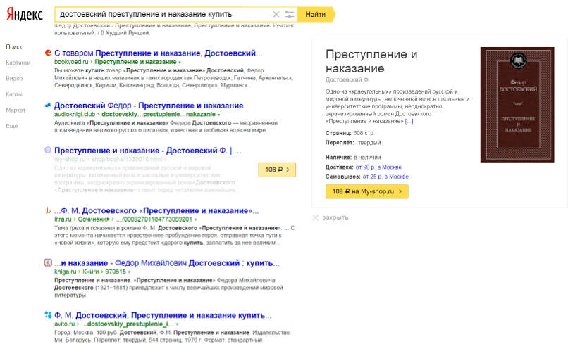 Сниппет при наведении курсором "зажигает" кнопку справа с ценой и символом рубля. Справа выплывает окно с информацией о продукте.