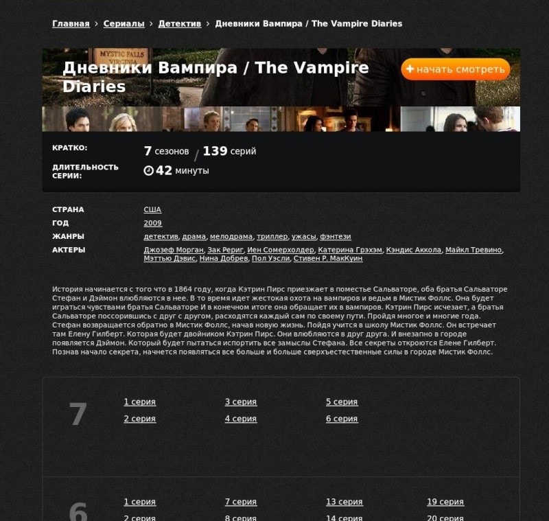 Итак вот так выглядит основная страница сериала, в ней будут ссылки на все серии из всех сезонов, в последовательности от самого старого к самому новому