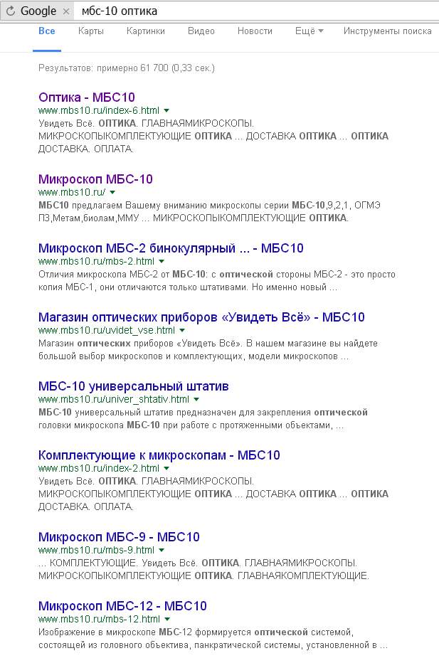 ключ "Микроскоп МБС-10" вписан в каждую страницу сайта. Результатов всего 61700 в выдаче. не сложно пропихнуть