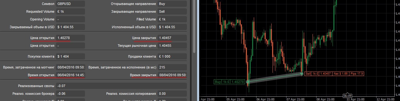 Сделка также по фунту (т.к. только на фунте торгую) сделанная 6 апреля, вход в сделку был на дневном минимуме, на 1.4027