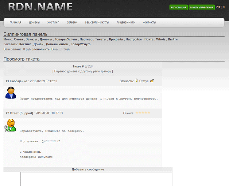 Там оказывается даже нет возможности получить код для переноса домена. Я так понимаю, надо связываться через тикеты? Но там никто не отвечает уже несколько дней. Не мне одной. И похоже уже не ответят: /ru/forum/701358
