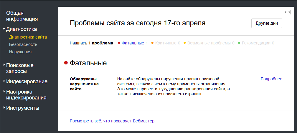 Для интереса проверил свои сайты в разделе диагностика. На нескольких есть предупреждение: