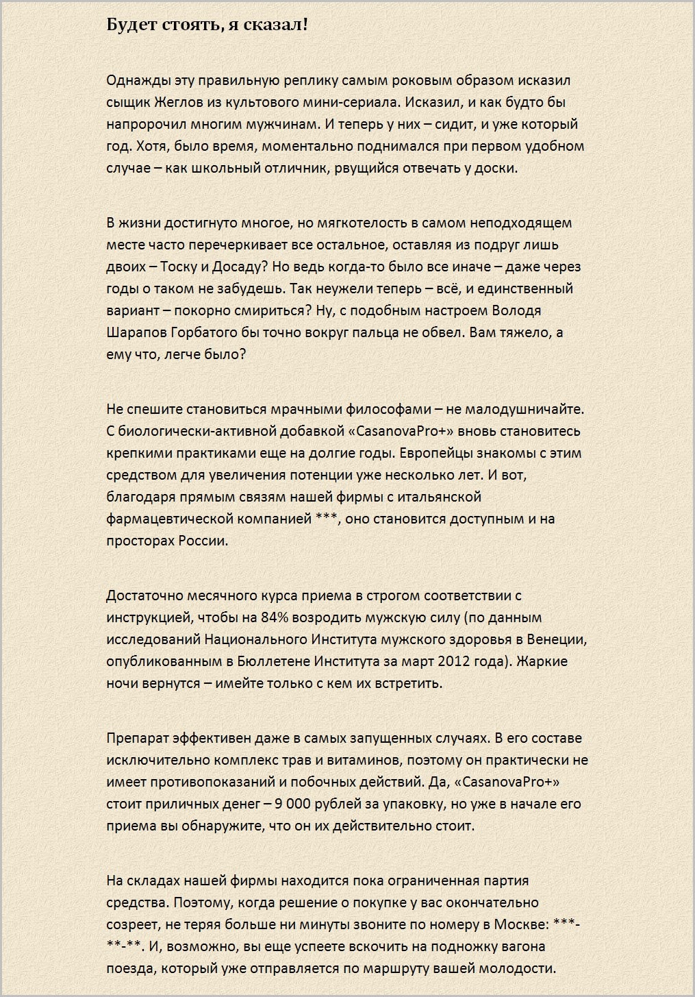 Так вот я думаю, что в этом тексте я поработал в жанре именно такой своеобразной "пародии" на "настоящий" продающий текст (почему настоящий в кавычках – потому что, на самом деле, никто никогда не скажет, что это такое – не сухим вымученным определением, а человеческим языком). И именно потому, что я это прекрасно осознаю, я думаю, что и в жанре настоящих боевиков – "настоящих" продающих – я еще смогу сказать какое-то свое слово.