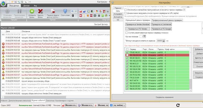 Приветствую. Понимаю, что вопрос бородатый, но все же не могу найти на него конкретный, а самое главное четкий ответ. Проблема в том, что последнее время в программе начало выдавать ошибку следующего содержания: ошибка NetworkMethods.PostDataAndLoadPage: Не удалось соединиться с HTTP-сервером 'passport.yandex.ru'. Парсить теперь не могу. Ранее все было нормально, использовал около 50 прокси-серверов. Добавлял в программу их не сам, поэтому не могу знать, нормальные ли они...сейчас подсвечены зеленым цветом, якобы указывая на то, что еще рабочии. Хотя где то слышал, что прокси-сервера могут выдаваться на месяц....может срок их истек...В общем что делать, не знаю...И связана ли вообще эта ошибка с прокси-серверами....Может кто подскажет что необходимо делать...и желательно детально. Если заменять прокси, то где покупать. Буду очень признателен любому совету. Спасибо.