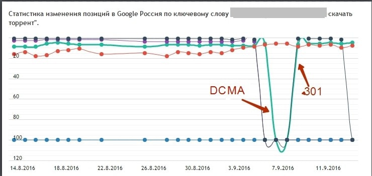 Зачем гадать, все ответы в выдаче. Смотрите как делают конкуренты 301 и как потом в топ все это возвращается. Также смотрите, почему у некоторых нет жалоб DCMA.