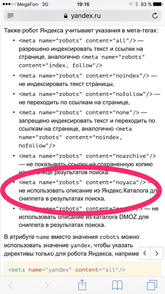 Я говорил про отключение описания каталога в сниппете яндекса!
