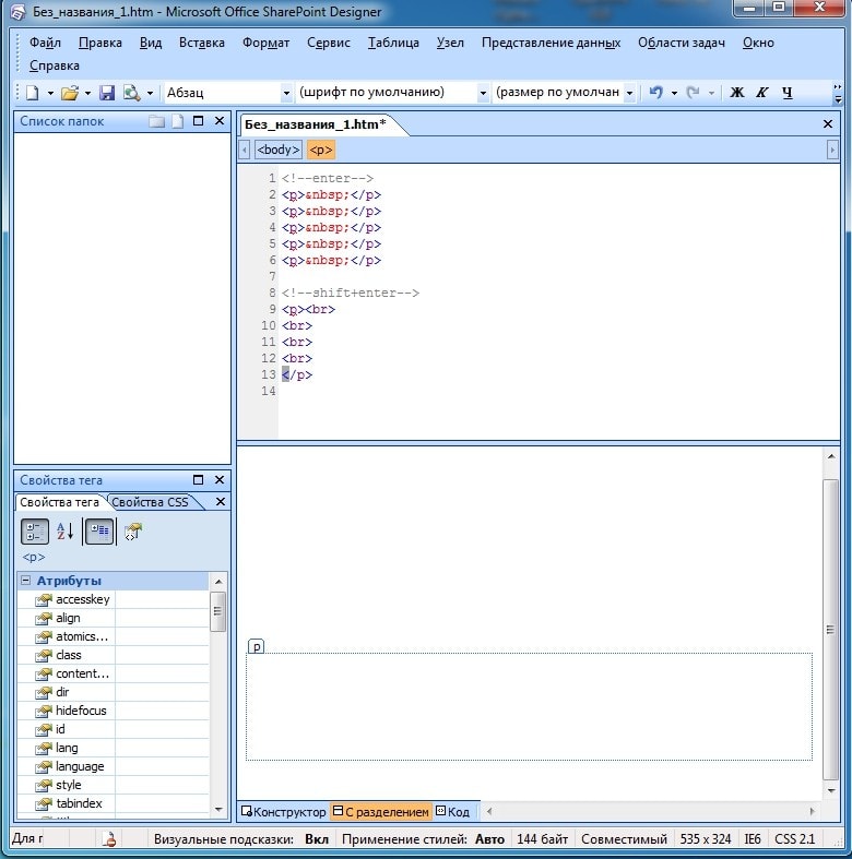 CTRL+Enter не помогает. Люди, кто юзает DremWeaver или еще что, посмотрите, что они генерят в визуальном редакторе, если перенос строки сделать по Enter? FrontPage 2003 втыкает конструкцию <p> </p>, а по логике нужно просто <br> втыкать.