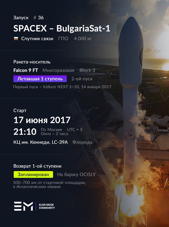 Falcon 9 Full Thrust выведет на геопереходную орбиту (ГПО) геостационарный спутник связи BulgariaSat-1, принадлежащий болгарскому спутниковому оператору, компании BulgariaSat. http://bulsat.com