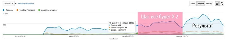 С февраля 2017-го - полностью органический трафик, рост позиций по 20 тыс. наименованиям в Яндекс и Google.