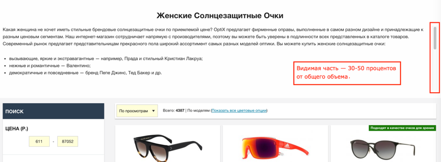 1. Кейс № 1 (Рис. 8), в котором санкции были применены к интернет-магазину с большим числом текстов, размещенных на страницах категорий и в скроллинге. Объем скрытой части текста — от 50 до 80 процентов от общего....