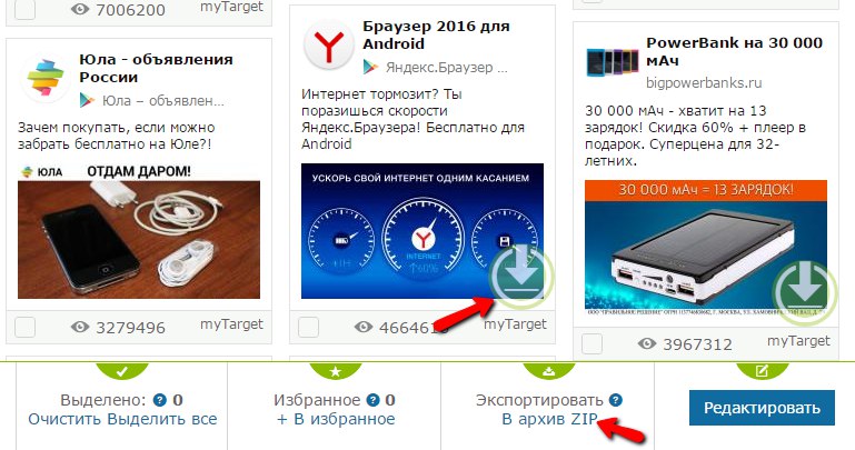 Любое рекламной объявление (баннер, тизер, видео и т.д.) можно скачать в 1 клик, нажав на значок скачивания, либо скачать в zip сразу несколько.