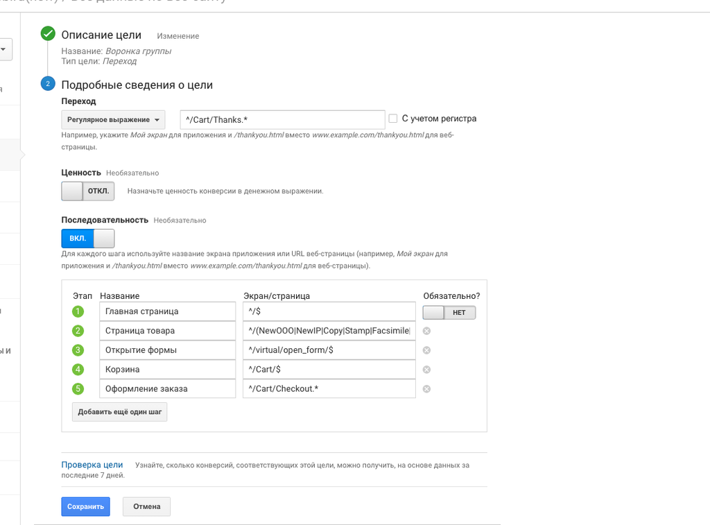 Здравствуйте форумчане! Пытаемся настроить d Google Analytics Последовательность шагов для визуализации воронки http://stamps.spb.ru/