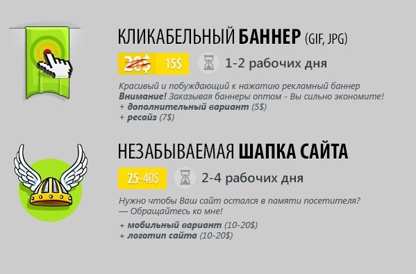 Всем привет! Предлагаю свои услуги по разработке привлекательных баннеров, тизеров, рекламы, шапок и прочей графики для ваших (или не ваших) сайтов!