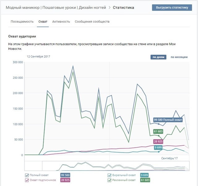 Вы мне показываете свежий одномесячный паблик, который еще недели не прожил без рекламных вливаний. Если вы добавите показатели Рекламного охвата и Вирального охвата, то заметите, что собственный охват полностью ограничивается охватом подписчиков. Но весь охват подписчиков сейчас в технической зоне, когда после подписки прошло слишком мало времени, чтобы стало понятно, вываливается контент сообщества из ленты Новости или нет. То есть, рассматривать статистику этого сообщества всерьез нужно месяцев так через 6.