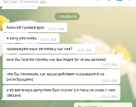 Из последнего, прикрепляю небольшой, сегодняшний скрин, 1 день как начали работу и клиент сразу же написал про бурный рост целевого трафика.