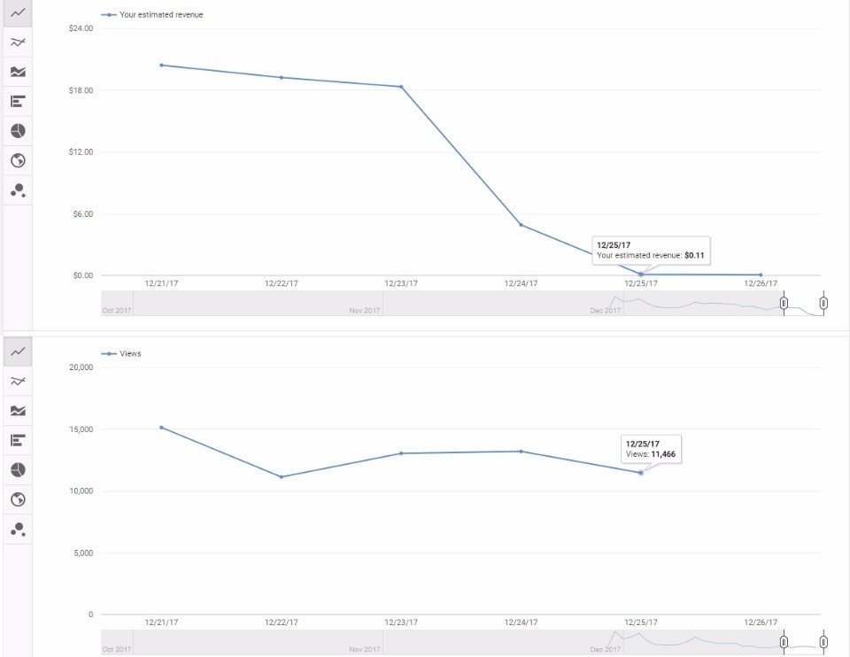 На графике стабильные дни, самые жирные были в начале месяца, до этого доход стабильно падал вместе с просмотрами, а тут в ноль, а просмотры остались. С остальными видео на канале всё ок
