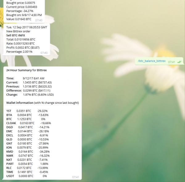 Присылает уведомления о совершенных ордерах - дата, сумма, % прибыли, выводит инфу о депозите :2cents: