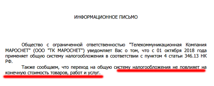 Недавно мы объявили, что с 1 октября этого года переходим на общую систему налогообложения. Это важное событие говорит о том, что компания ООО «ТК МАРОСНЕТ» вышла на новый уровень. Новые стандарты предполагают наличие высокой ответственности и увеличение масштабов бухгалтерского учета. В связи с этим возникло множество вопросов, которые касались изменения цен на тарифы.