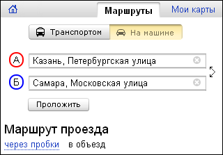 Начиная с сегодняшнего дня, Яндекс.Карты предоставляют пользователям возможность прокладывать автомобильные маршруты по всей России, как внутри городов, так и между ними. Кроме того, сервис показывает пробки везде, где о них имеются данные. Чтобы избежать затруднений движения на пути, пользователю нужно построить маршрут в объезд пробок: указать начальную и конечную точки и включить слой «Пробки».