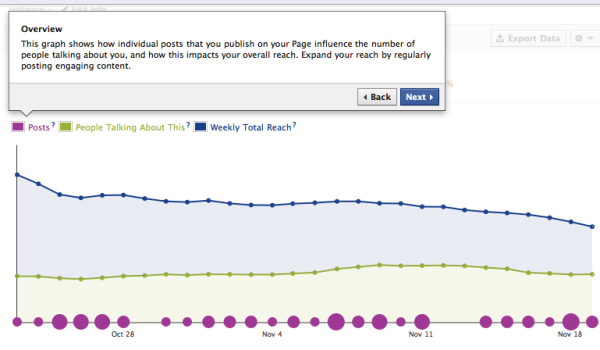 Также Facebook представил метрики «People Talking About This» и «Weekly Total Reach». Первая отображает количество уникальных пользователей, которые создали какой-либо контент о вашей странице за прошлую неделю, при условии, что они никогда ранее не делились контентом вашей страницы. «Weekly Total Reach» — актуальное количество людей, которые просмотрели этот контент; показатель формируется путем сложения всех пользователей («друзей»), которых достиг каждый пост, которым поделились.